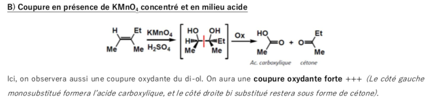 Voici la partie du cours concernée par l'item B, c'est une coupure oxydante forte : les parties di-substitué de l'alcène seront transformé en cétone et les parties mono-substitué seront transformé en acide-carboxylique !