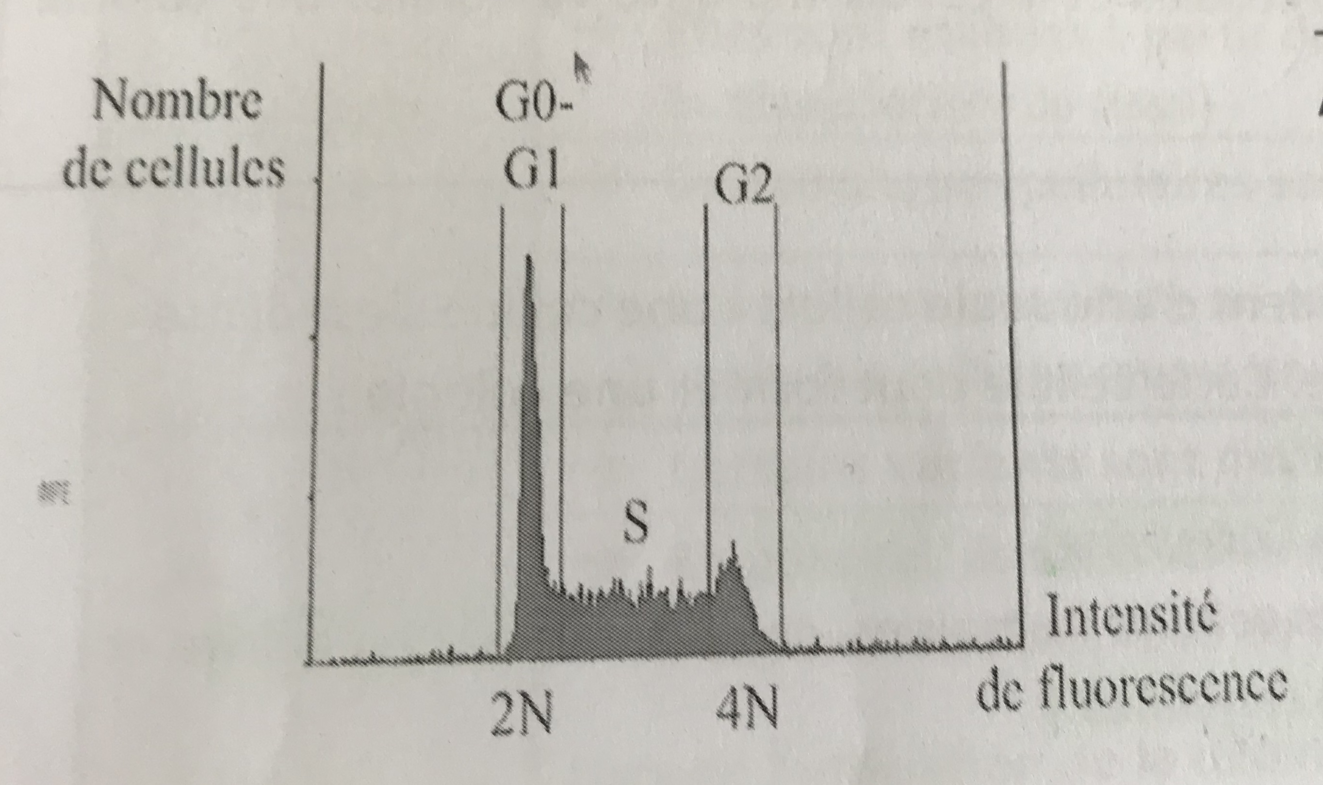 Du coup notre intensité est proportionnel à notre quantité d'ADN on est bon car G0-G1 on est à 2N et G2 4N et on voit bien que l'intensité est doublée en abscisse.