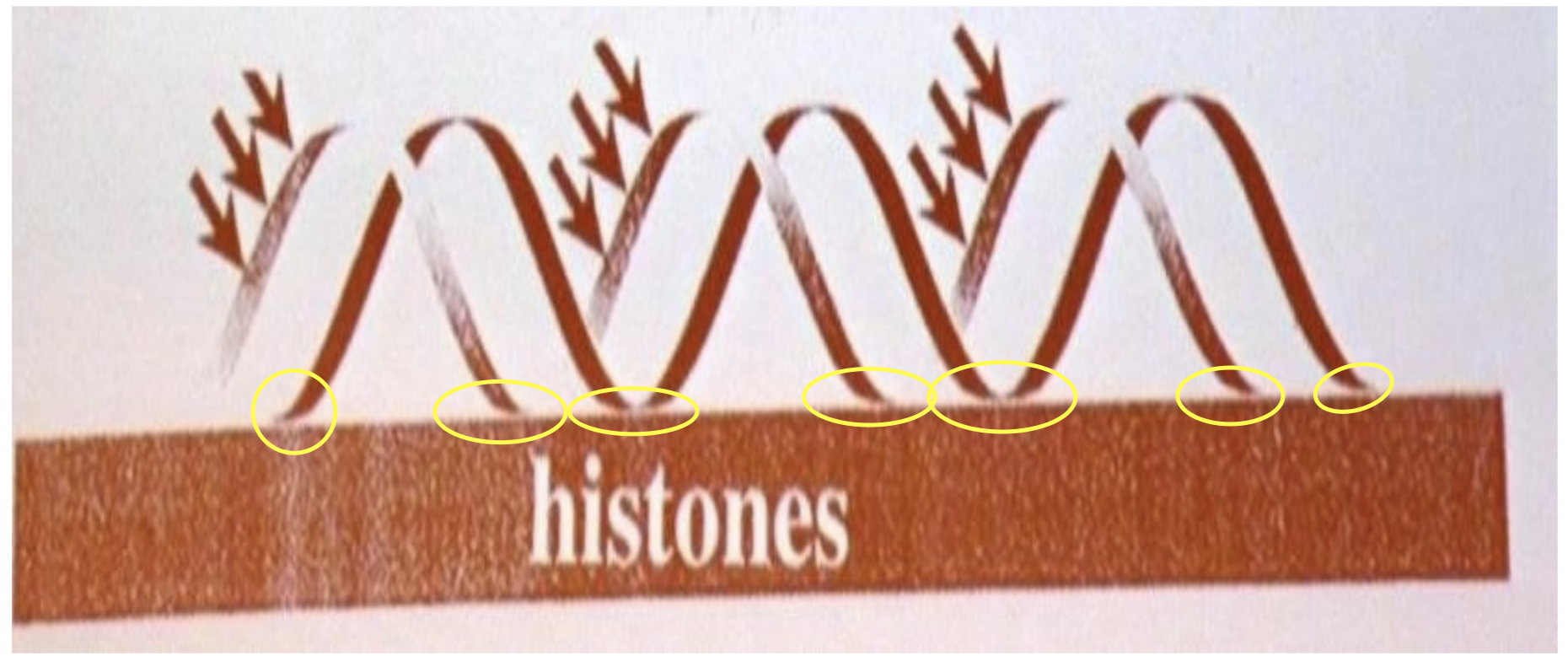 comme tu peux le voir sur le schéma, là où il y a les flèches, c'est les endroits de ton hélice qui ne sont pas en contact DIRECT avec l'histone, c'est là ou la DNASE1 agit et pourra COUPER).Du coup tous les endroits que j'ai entouré en