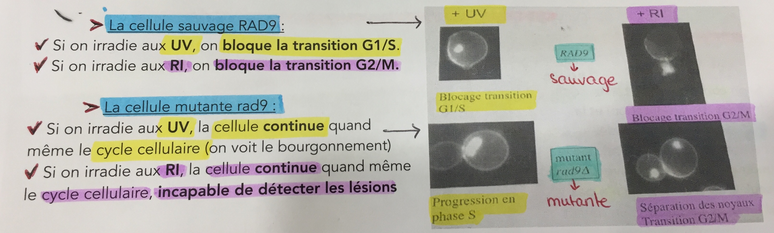 Lorsqu’on irradie une cellule mutante RAD9 aux UV et aux RI on a dans les deux cas une poursuite du cycle cellulaire sauf que lorsqu’on irradie aux RI la cellule est incapable de détecter les lésions. Est-ce qu’on aura alors une colonie de cellules défectueuses qui vont finir par mourir ? Et si c’est le cas est-ce que ça ne concerne que la cellule mutante RAD9 irradiée aux RI?