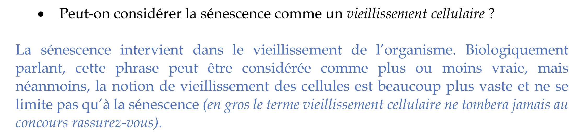 Du coup je voulais savoir si un item disant que : "la sénescence cellulaire correspond à un vieillissement de la cellule" serait à compter vrai ou pas ? :question: Perso, je l'aurais mis faux mais peut-être que le prof ne sera pas assez pointilleux et l'aurait compter vrai ?