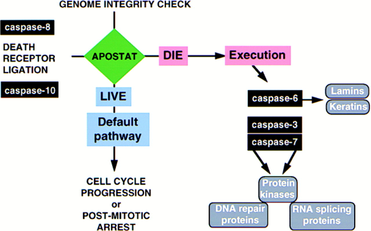 Alors en fait il va y avoir une action conjuguée. C'est à dire que quand ta cellule reçoit des messages de mort cellulaire, il va y avoir des mécanismes qui vont amener les caspases pro-effectrices à cliver les caspaces effectrices. Ces caspaces effectrices sont des protéases qui vont hydrolyser tout un tas de protéines (sur l'illustration que je t'ai mis on voit bien que les caspases 3,6 et 7 hydrolysent les lamines, keratines, les protéines de réparation de l'ADN, des protéines kinases, des protéines qui permettent l'épissage de l'ARN). Toutes ces protéolyses seront responsables de la mort cellulaire. Une fois que toutes ces différentes protéines seront protéolysées, il y aura formation des corps apoptotiques et les macrophages interviendront à ce moment là pour phagocyter le tout. :wink2: