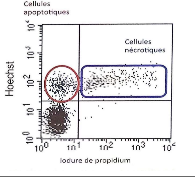 Du coup sur le schéma tu observes bien que les cellules entourées en bleues seront nécrotiques (car elles sont situées en haut, et cette fois-ci, la concentration d'iodure de propidium est consigné en ordonnée), alors que tes cellules qui seront en bas à droite (entourées en rouge) seront tes cellules apoptotiques !