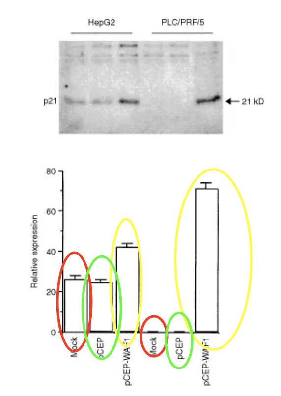 En fait tu vois bien que dans la figure 2, dans la colonne où l'on a transfecté pCEP-WAF1 (en jaune sur la figure en PJ), le niveau d'expression de p21 (la hauteur du rectangle quoi) est plus élevé que dans pCEP (vert sur la figure) ou Mock (en rouge) !! Regarde la pièce jointe pour t'aider :wink2: