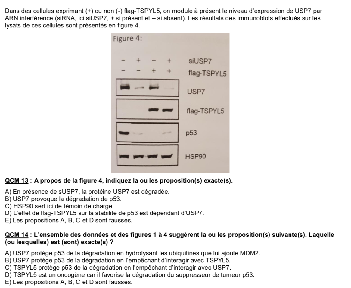 Item 13D: Il suffit de comparer une situation où on a flag-TSPYL5 avec et sans USP7 ! Or c'est le cas ici, dans la 3ème et 4ème colonne on a flag-TSPYL5 avec et sans USP7, on regarde dans la ligne de p53 et on voit effectivement que suivant s'il y a présence d'USP7 ou non il y aura soit pas de trace ou soit une trace de p53 !