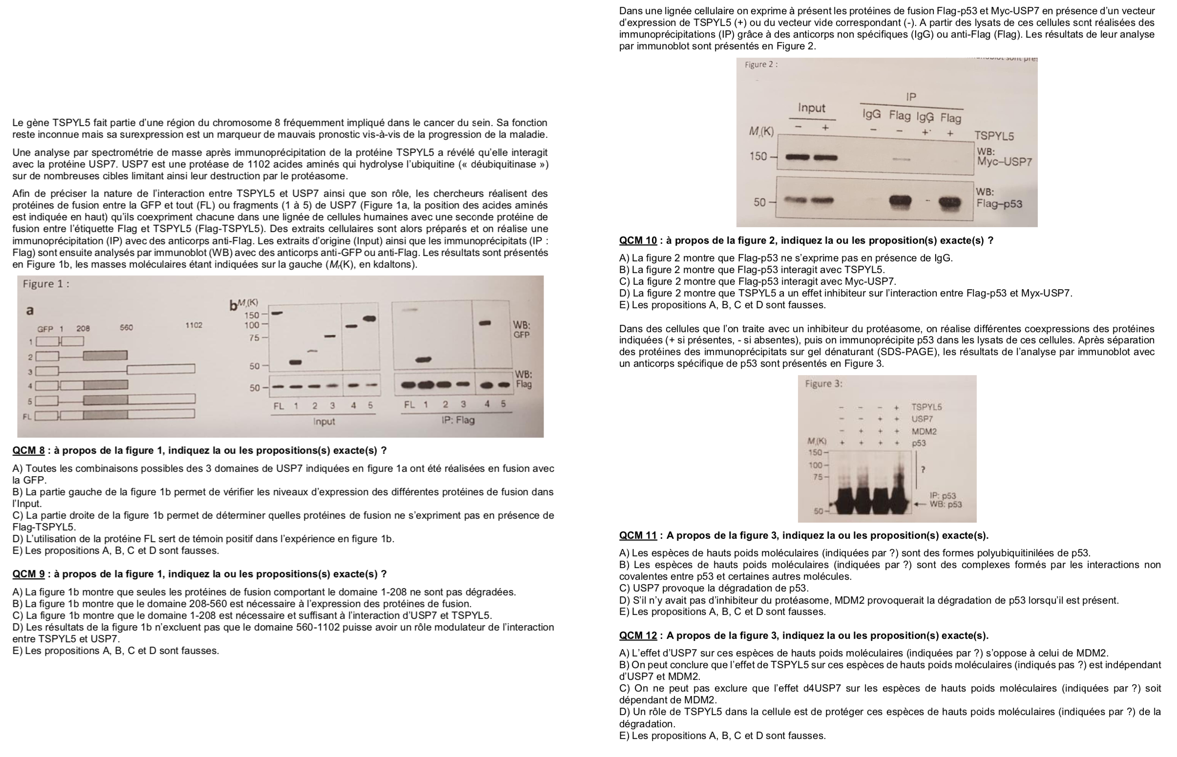 --> Item 12C: c'est vrai on ne peut pas l'exclure, pourquoi ? Tout simplement parcequ'on a pas de piste avec USP7 seul ! On a seulement une piste avec USP7 et MDM2 et USP7, MDM2 et TSPYL5, on ne peut donc pas conclure sur l'effet d'USP7 SEUL sur p53 :)