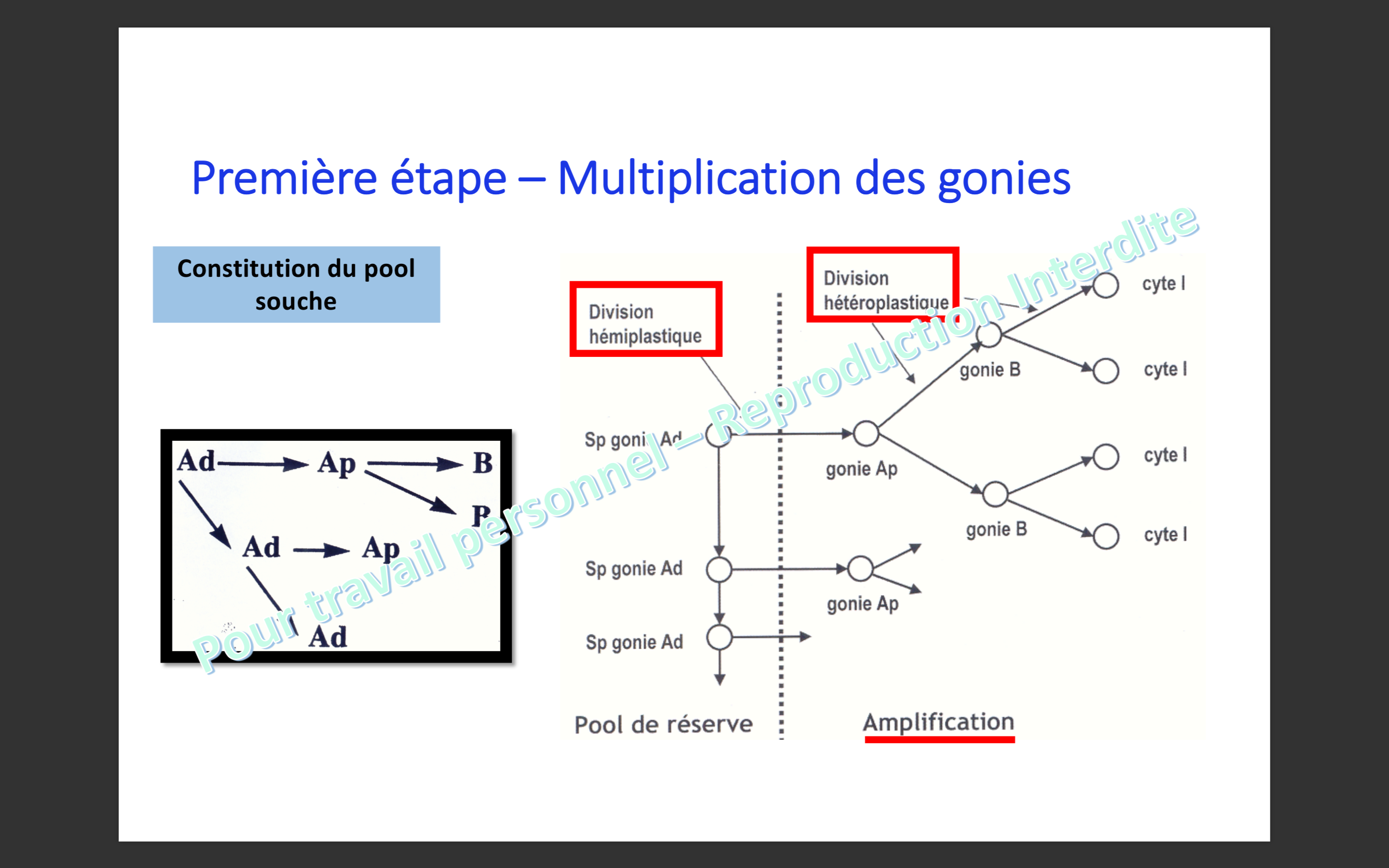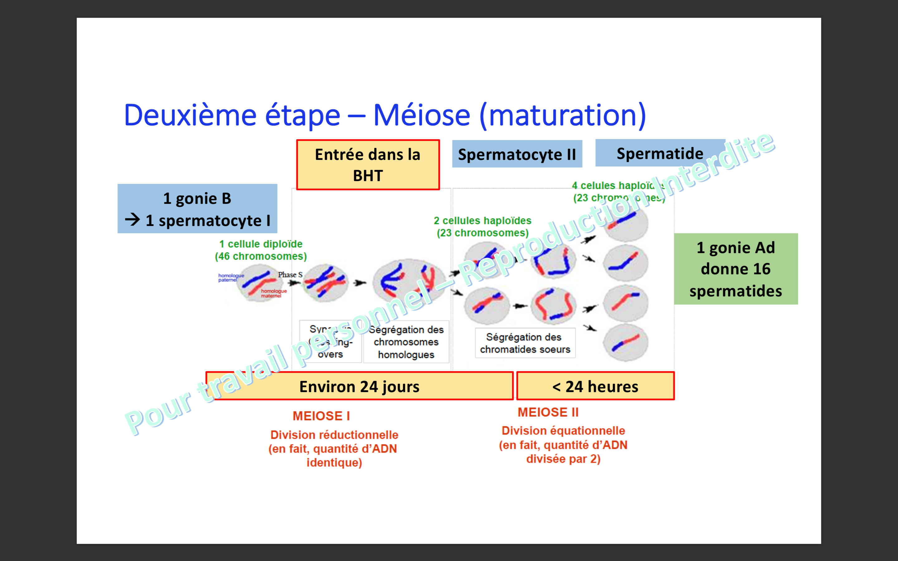 Dans la ronéo page 18 , il est dit que une Spermatogonies B donne 1 seul spermatocyte 1 (ce qui contredit la diapo 65 mais affirme la diapos 68 du prof ) , mais un peu plus bas il est dis que une gonie Ad donne 16spz alors que 1 Ad donne 32 SPZ en toute logique :