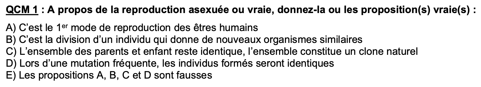 Salut, je ne comprends pas pourquoi la C est comptée juste. Justement le prof n'avait pas insisté en cours sur le fait que les organismes utilisant la reproduction asexuée n'est pas identiques mais SIMILAIRES ?