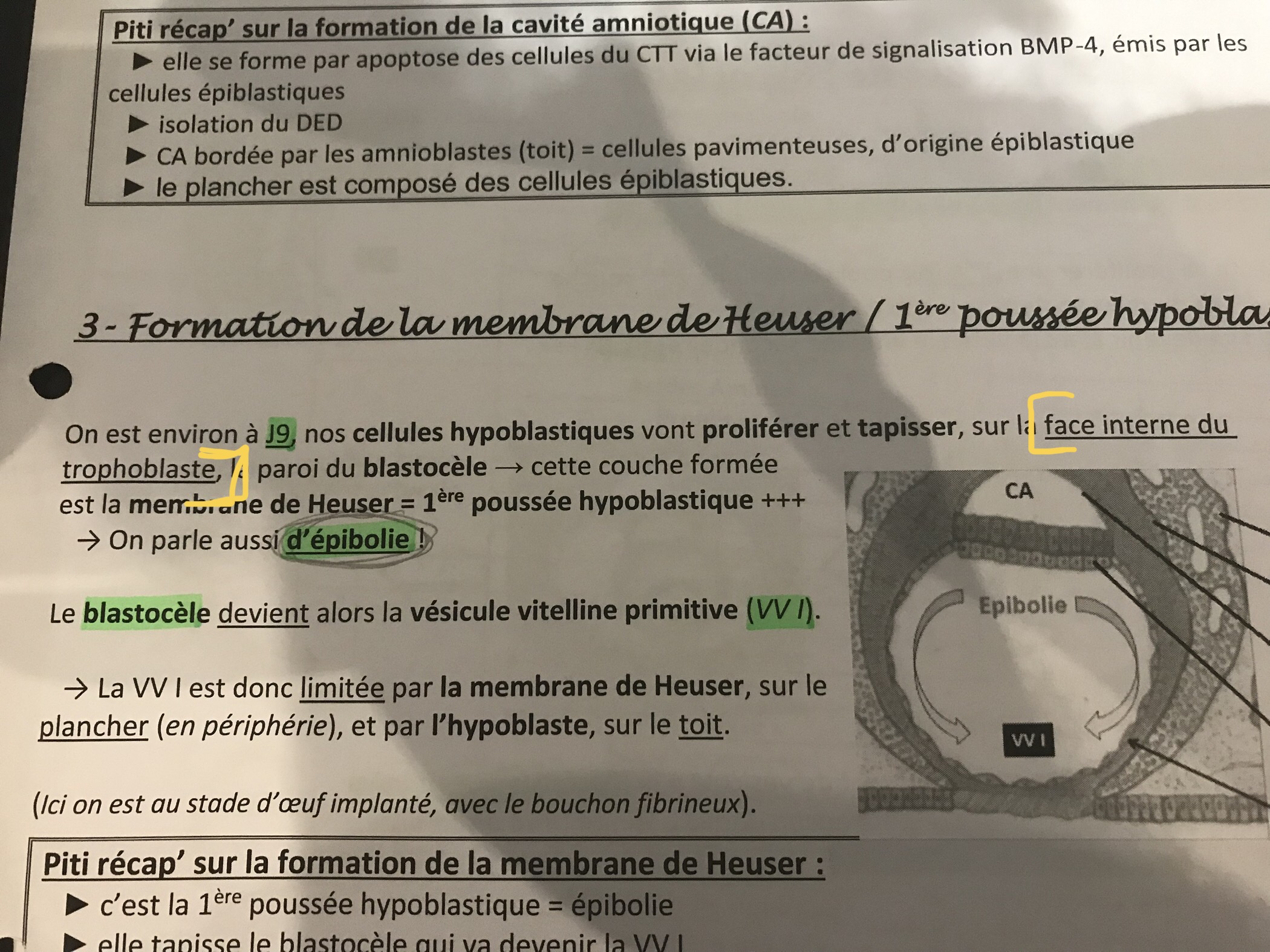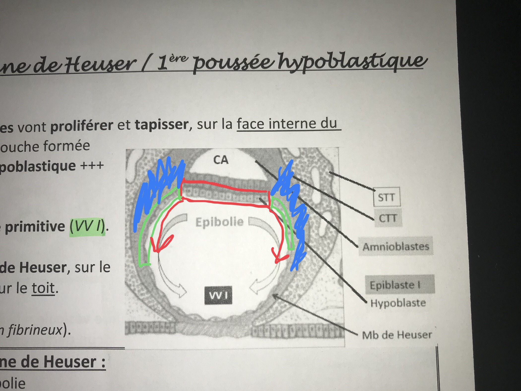 Regarde dans la ronéo de l'année dernière on voit notre couche trophoblastique (vert) et notre couche hypobblastique va faire sa membrane de heuser à l'intérieur (rouge). Le MEE est en bleu est ce situe bien collé au cellules trophoblastiques. :/