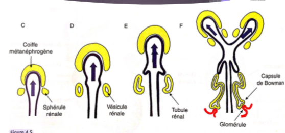 Ici tu vois bien qu'à l'étape F en haut tu as [b]2 coiffes métanéphrogènes[/b] avec leurs sphérules comme au niveau de l'étape C car il y a justement eu dichotomisation.