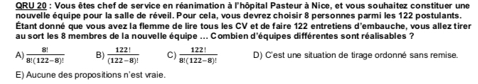 Si t'étais pas là ou tu t'en souviens pas alors je t'explique ;) en fait imagine t'as 3 personnes (on les nommera Emma Margot et Hugo) qui postulent, quand tu les choisis c'est pareil de tirer Emma-Margot-Hugo ou Hugo-Emma-Margot ou Margot-Hugo-Emma, dans tous les cas t'auras les mêmes personnes et l'ordre n'a pas d'importance, on dit donc que le tirage est non ordonné, si l'ordre comptait alors on utiliserait l'arrangement, mais pour revenir sur tes 8 personnes parmi 122 on est bien d'accord que c'est pareil, ce qui compte est les éléments (les personnes) choisis et non pas l'ordre ! En soit tu peux les tirer 1 par 1 mais vu que l'ordre ne compte pas ça revient à faire un tirage simultané. Souvent tu peux tomber sur ce genre d'énoncé où on ne dit pas explicitement ce qui est recherché et c'est à toi de te demander "qu'est ce que je cherche" et "est ce que c'est ordonné ou non".