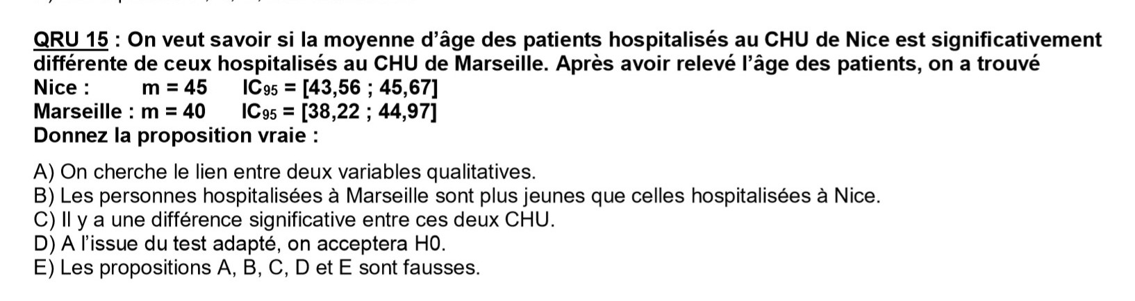 Salut, dans la correction de ce QCM il est dit que l'item D est vraie car il n'y a pas de différence entre le CHU et que donc on accepte HO; mais je comprend pas comment on sait qu'il n'y a pas de différence