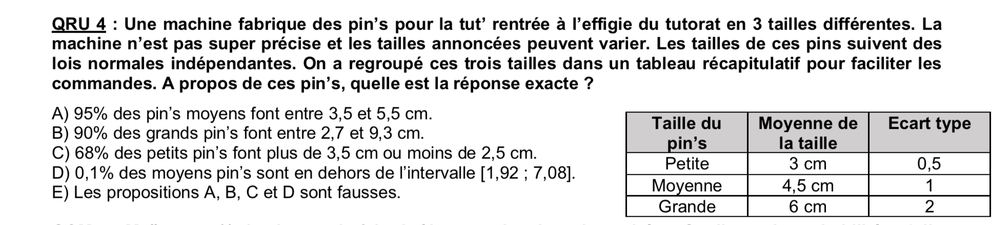 Vous voyez que pour avoir X compris entre u-sigma et u+sigma on a une probabilité de 68%, du coup dans ce QRU ça se traduit en P(2,5<X<3,5)=68% : la probabilité qu'un petit pins mesure entre 2,5 et 3,5cm est de 68%.