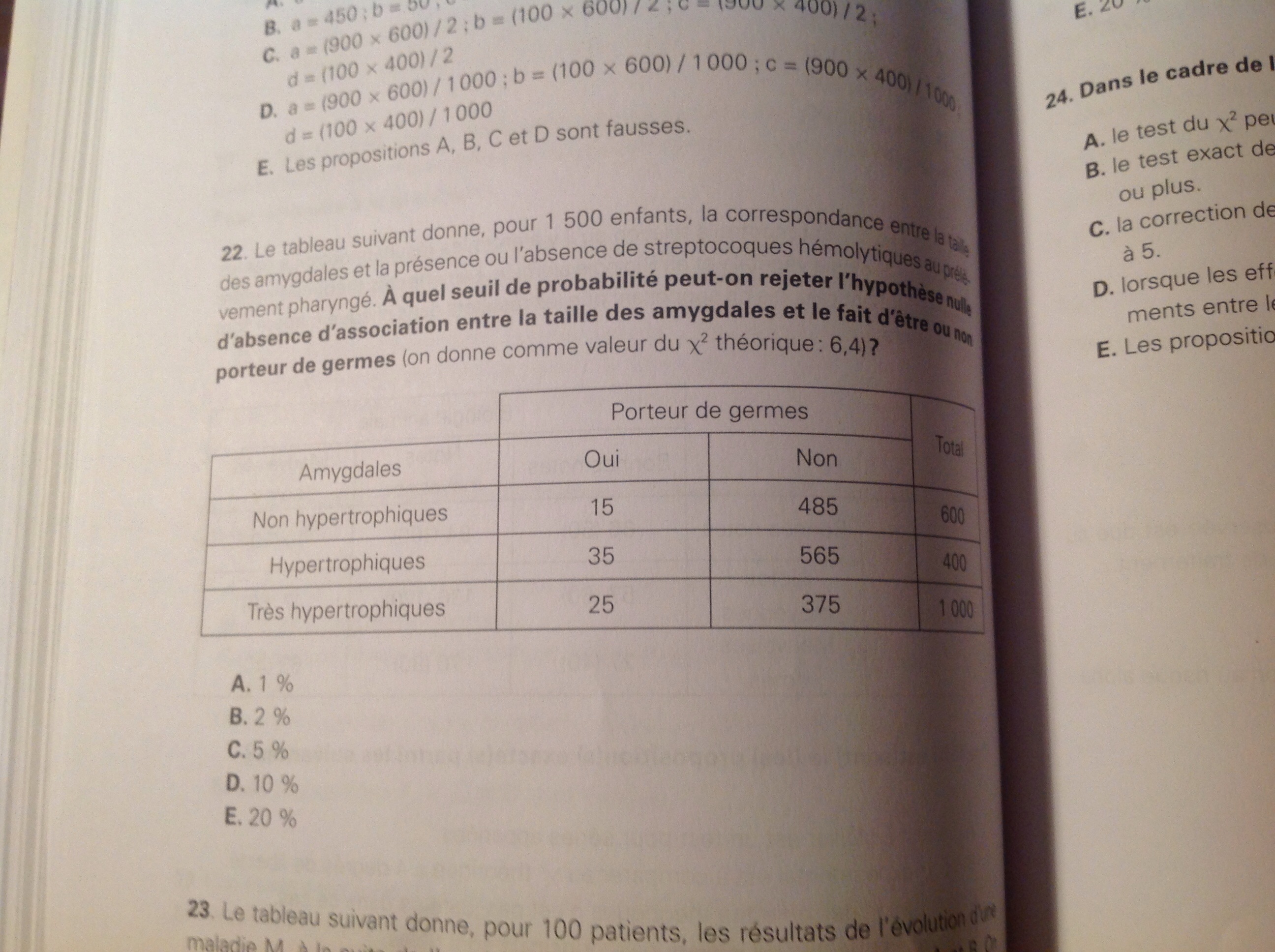En fait vu que ton paramètre calculé (et non pas théorique comme marqué dans l'énoncé!) du X2 vaut 6,4 tu vas le comparer aux valeurs du tableau du X2 pour connaitre le risque pour lequel on accepte H1, tu vois bien que pour alpha=0,05 le paramètre vaut 5,99 et vu que 6,4>5,99 on pourra accepter au risque 5%.