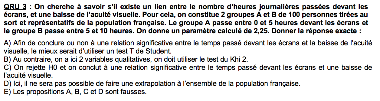 Je ne comprend pas trop la correction de ce QCM, pour moi la baisse d'acuité visuelle est bien une variable qualitative mais le nombre d'heure est une variable quantitative. De plus, je ne comprend pas car à un moment on nous dit que le test le plus adapté est la comparaison de moyenne et à l'item d'en dessous ils font le test du Q2... Est- ce que c'est possible d'avoir une correction svp :)