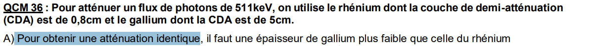 pcq "pour avoir une atténuation identique" je comprends pas pq il faut que la ga est une épaisseur plus importante. Sachant que pour moi à 1CDA , elles ont la même atténuation càd que eux deux laissent passer 50% des photons . Après c'est vrai que le rhénium est plus efficace dans le sens où une toute petite épaisseur permet d'atténuer 50% mais au final à une CDA l'atténuation est la même elle est de 50%