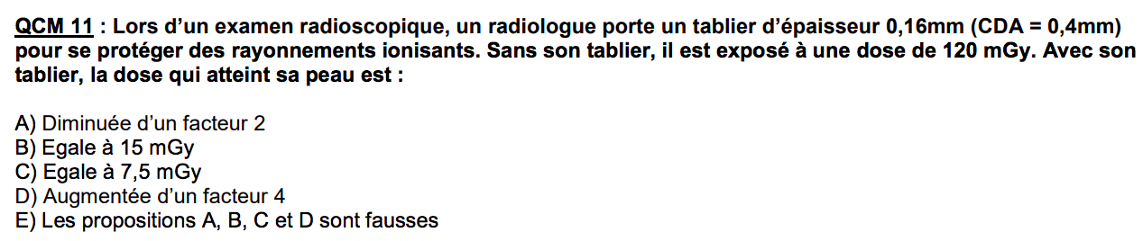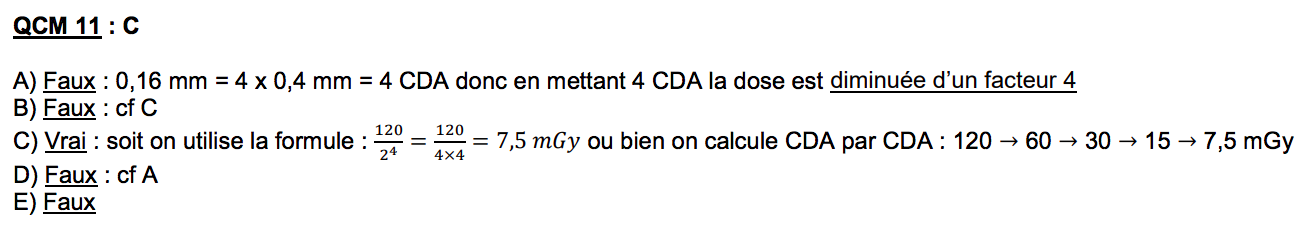 Dans ce QCM je ne comprend pas pour quoi au niveau de la correction on nous dit que la dose est diminué par 4, Pour moi elle est diminué d'un facteur 2^4 et donc divisé par 16. Est-ce que c'est possible d'être éclairé la dessus svp ?