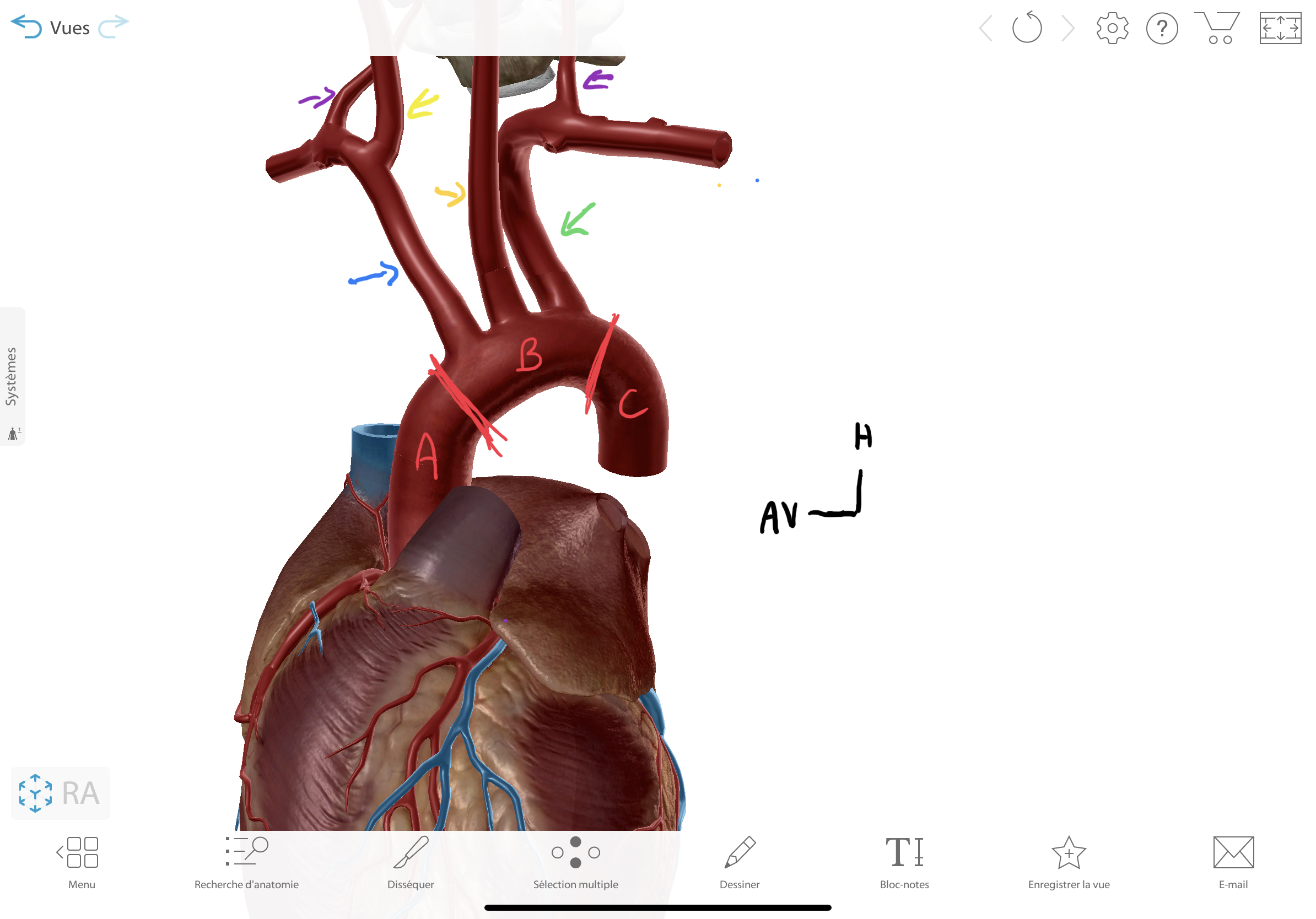 Sauf que tous ces vaisseaux ne sortent pas directement du coeur, il y a un gros vaisseaux : l’aorte qui va partir du cœurs et donner plein d’autre vaisseaux pour tout le corps. L’aorte possèdent trois parties : l’aorte ascendante A, la crosse aortique (B) et l’aorte descendante (C).