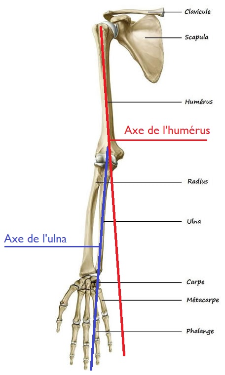 Quand tu tends ton avant bras paume de la main vers le haut tu peux voir que la partie interne de ton bras, l'ulna, n'est pas vraiment dans l'axe de l'humérus mais légèrement déporté sur l'extérieur. Je pense que c'est dû au valgus physiologique de l'avant-bras qui est de 5°.