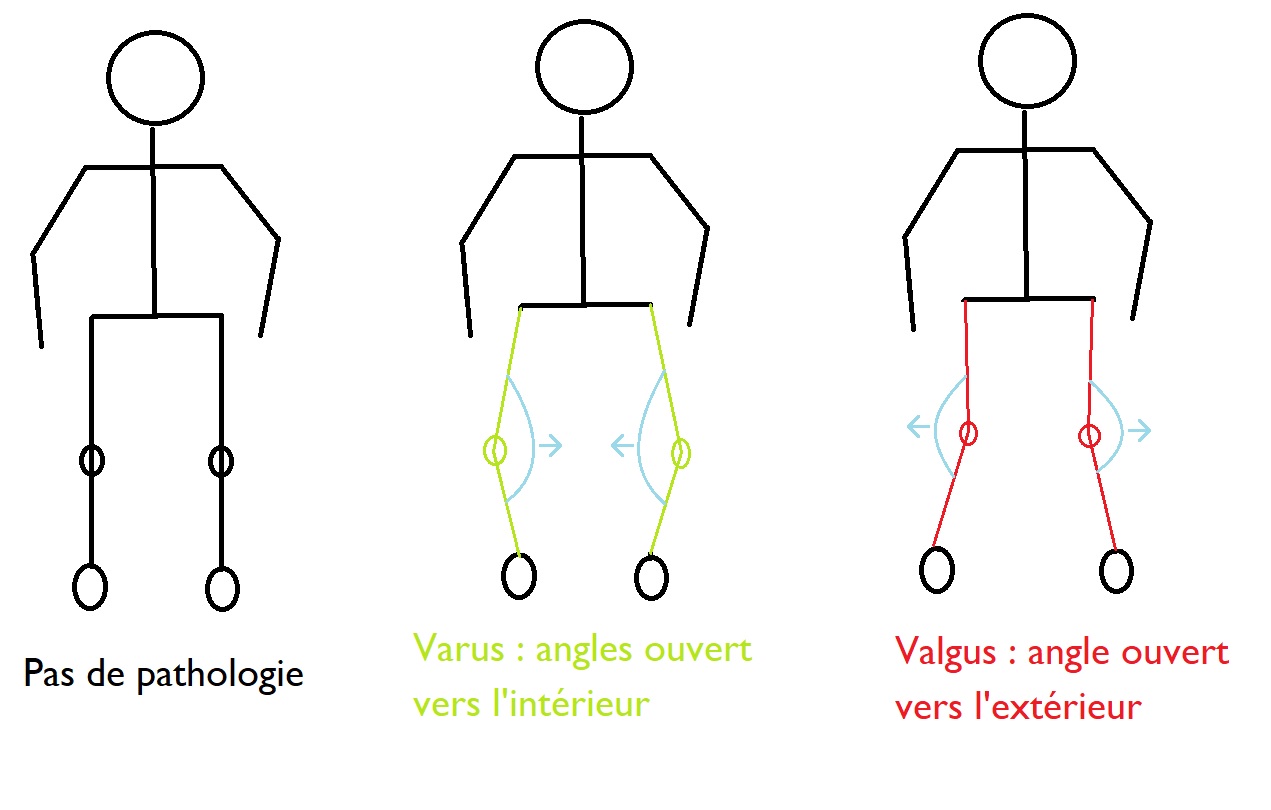 "Si entre l'axe du fémur et l'axe du tibia on a un angle ouvert on parlera de valgus. Si on a l'inverse on aura un varus (genu varum)"