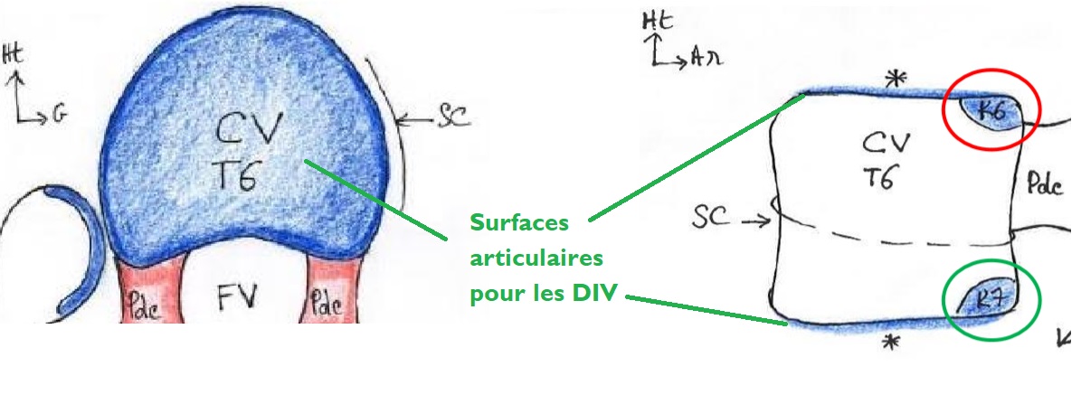 Les surfaces articulaires pour les DIV ou plateaux vertébraux se situent à la surface supérieure et la surface inférieure des corps vertébraux, elle sont donc difficiles à voir en vue de profil, mais en vues supérieure ou inférieure elles correspondent quasiment à toute la partie supérieure visible.