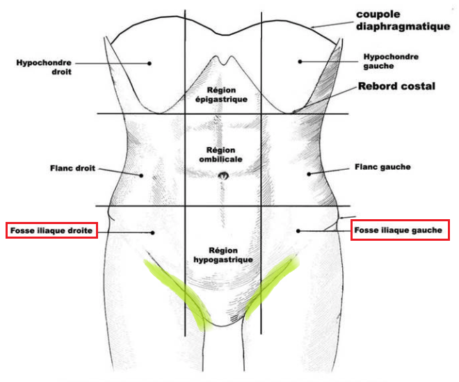Sur ce schéma tu vois encadrées en rouges les fosses iliaques et repassées en vert les deux régions inguinales.