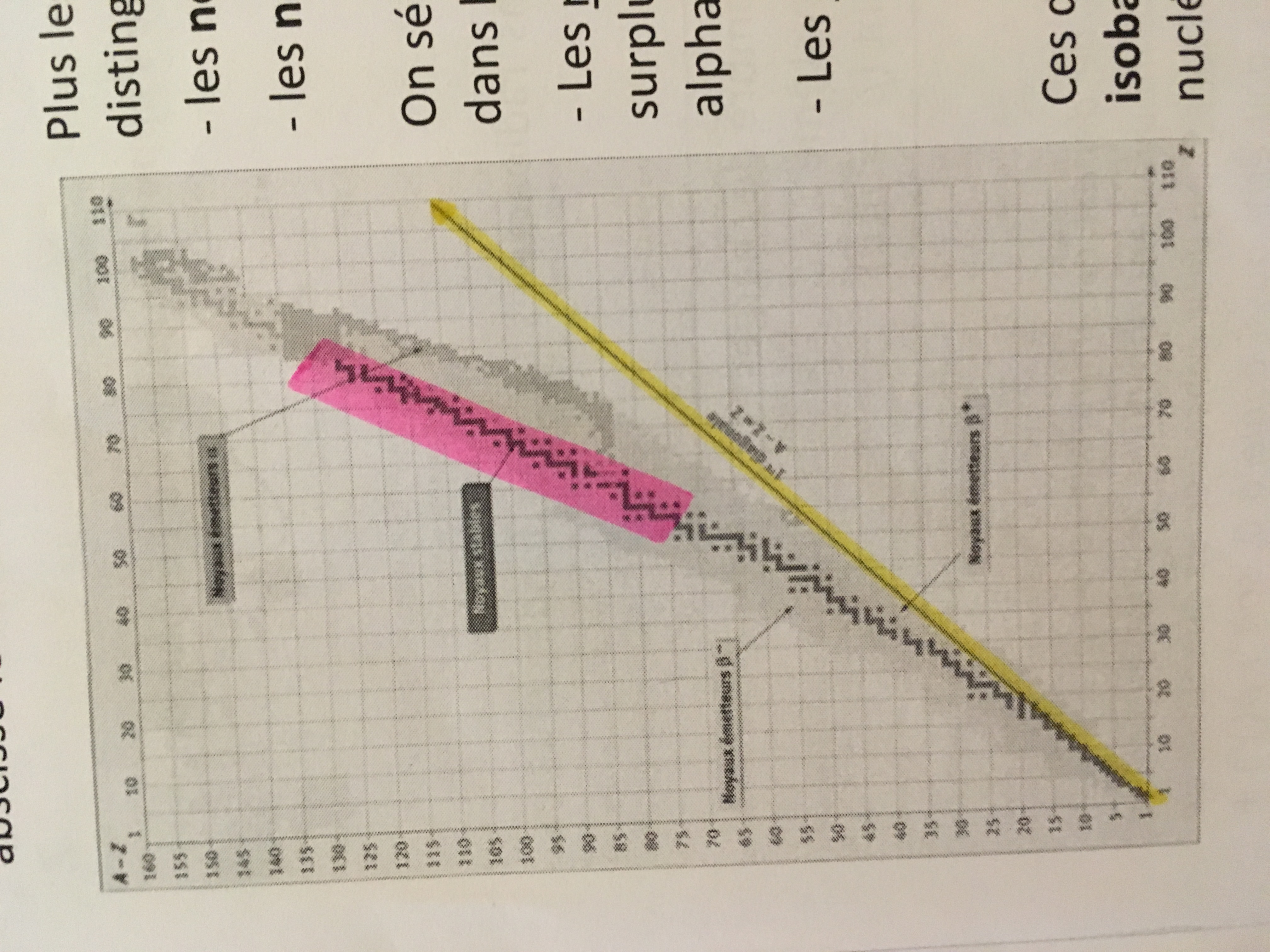 Je te remets la photo de la ronéo alors en jaune c'est la bissectrice et en rose c'est la ligne avec les noyaux stables lourds. Tu vois bien qu'ils sont éloignés de la bissectrice je te rappelle que c'est pcq ils ont plus de neutrons pour compenser leur grand nombre de protons, pour leur permettre de rester stables. En fait, les points foncés= noyaux stables et tout ce qui est autour= noyaux instables.