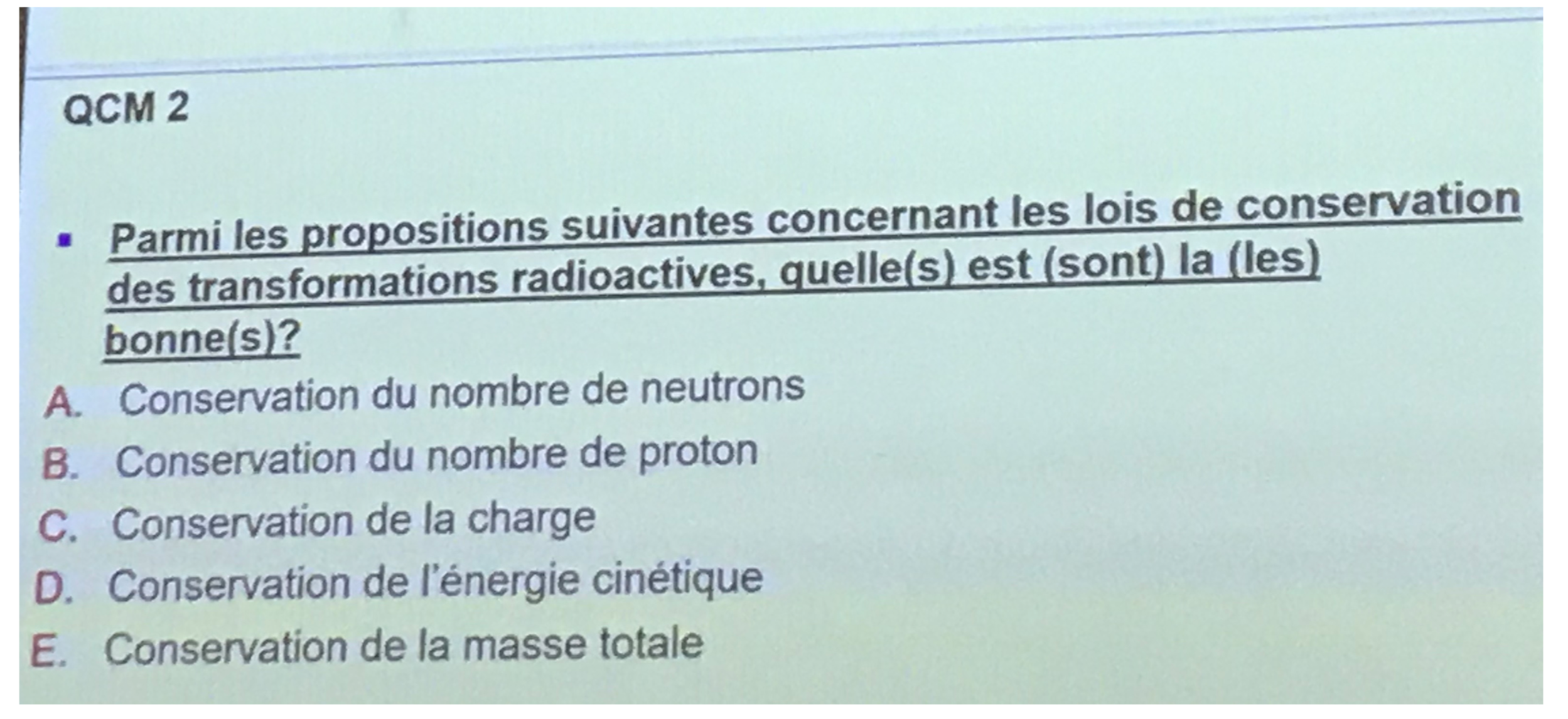 La réponse est uniquement la C, pourtant d'après toi on se place au niveau de la réaction, on ne compare pas que les 2 noyaux et ce pour les 2 profs. Mais il me semble que ce QCM prouve le contraire, car si on se place au niveau de la réaction, la B devrait être juste.
