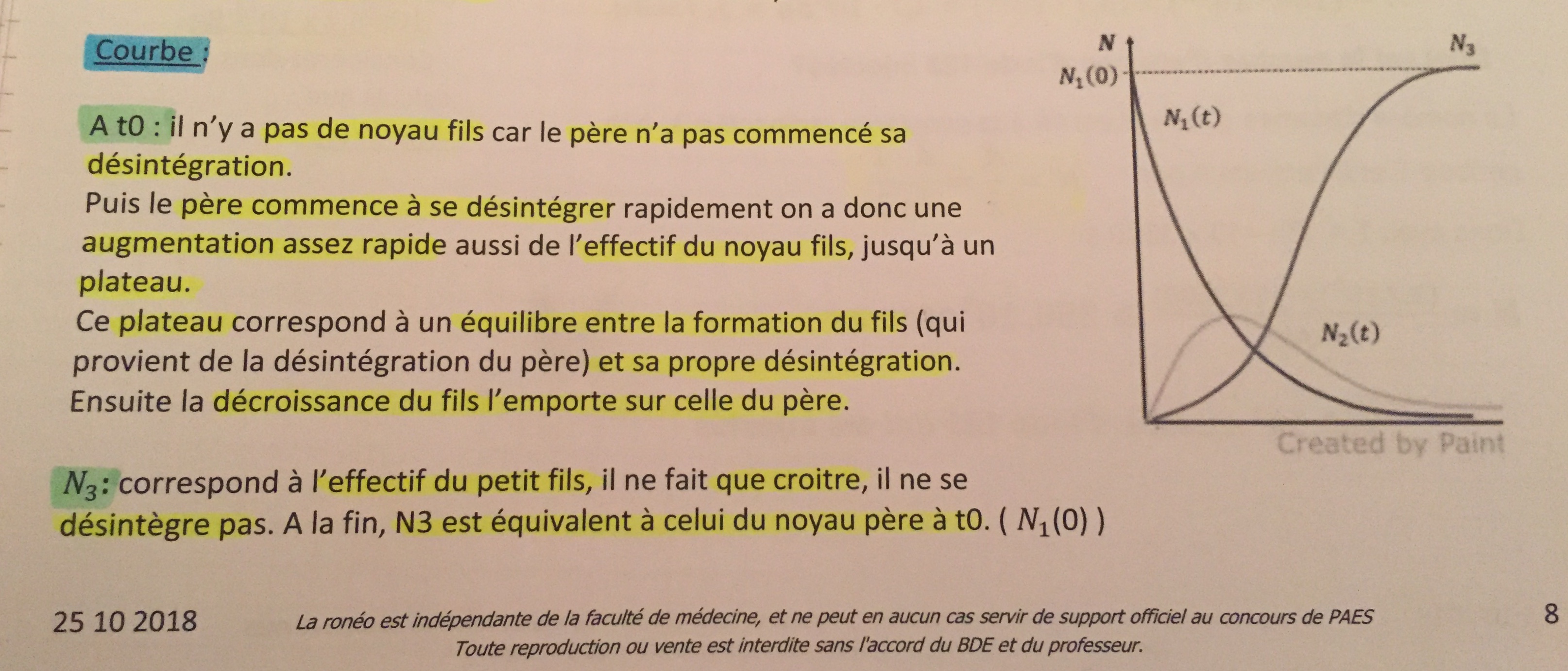 J’ai compris que la courbe de N1(0) est celle du noyau père à t=0 et qu’on la retrouve également à un certain temps après avoir commencé à se désintégrer (N1(t)) et vers la fin de la désintégration pour N2(t) mais du coup est-ce que la courbe claire c’est celle du noyau fils et la deuxième courbe foncée celle du petit fils?