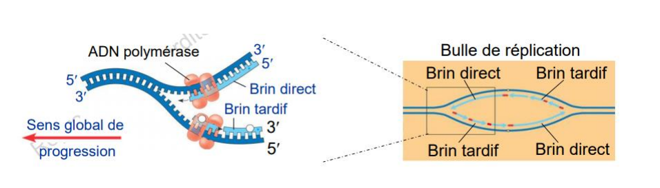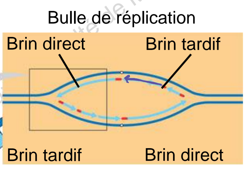 L'amorce du brin direct se situe au niveau de l'origine de réplication, du coup lorsque celle ci sera dégradé le trou qu'elle laissera sera comblé par la polymérase du brin fils tardif du même côté (en violet).