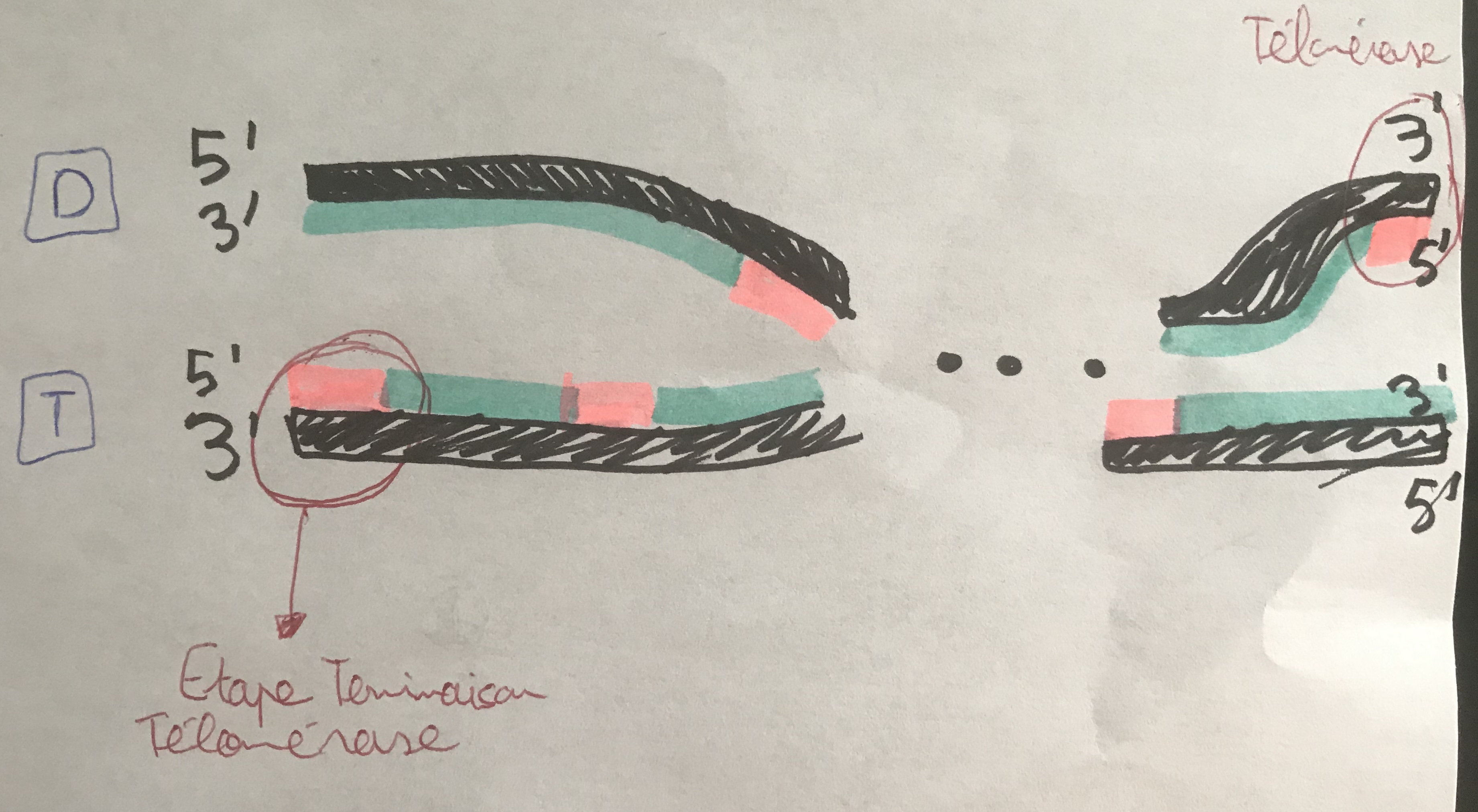 Sur le schéma on a les brins parents en noir les amorces en rose et les DRNTP en bleu. Le brin direct est en haut et le brin tardif en bas. On voit que sur le brin direct quand on se place à l'extrémité 3' du brin parent il faut une amorce afin que la réplication se fasse car on synthétise dans le sens 5'-3' du coup même si il est direct y'a l'intervention de la télomérase ?