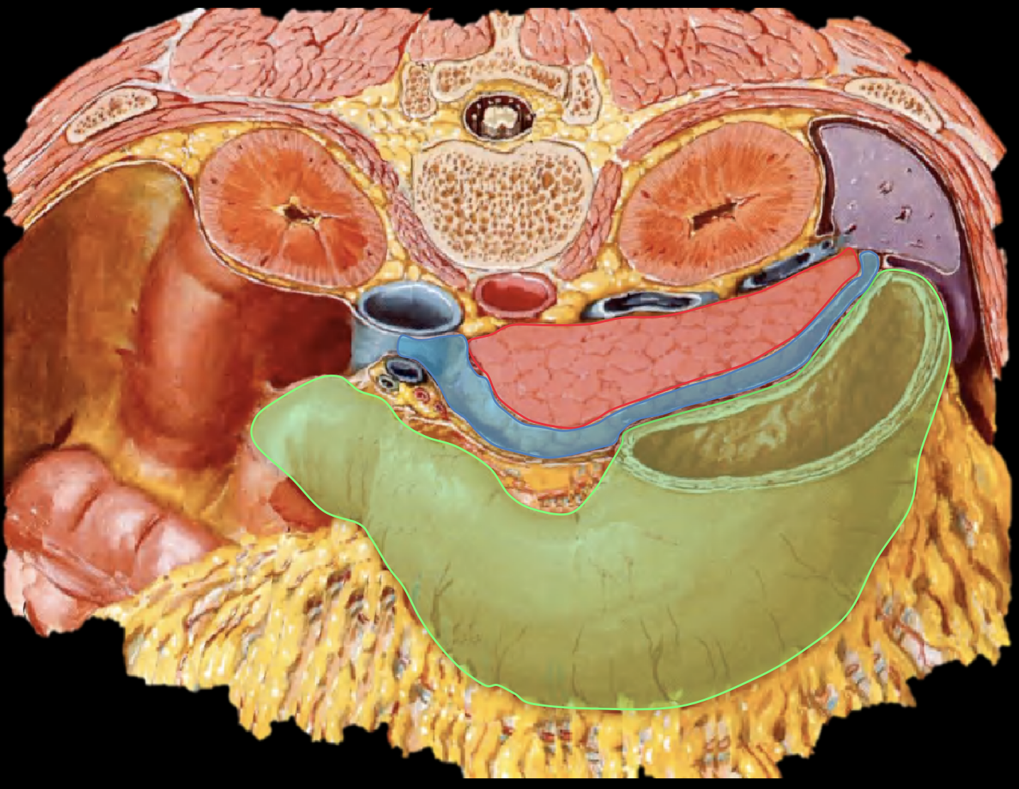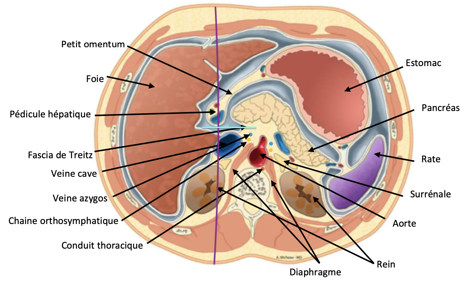 Je pensais aussi que la bourse omentale était en arrière de l'estomac et en avant du pancréas sauf que sur la coupe para sagittale du côté droit j'ai l'impression que le pancréas est en avant du Hiatus de Winslow et du coup il paraît en avant de la bourse omentale... Je comprends plus qui est en avant/en arrière de qui
