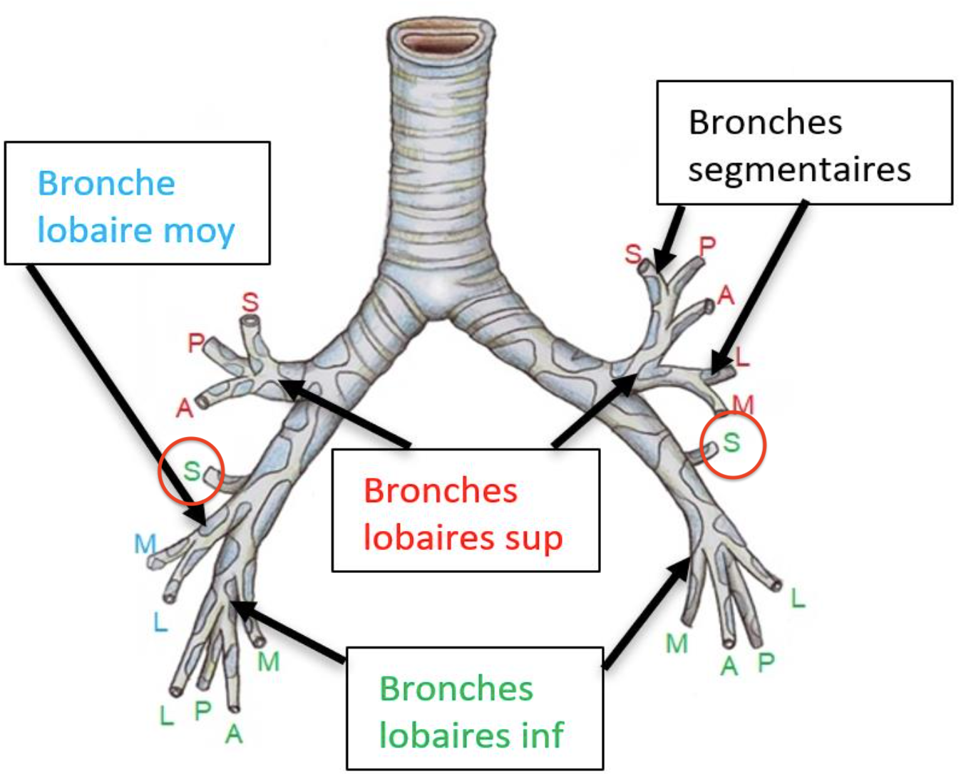 Dans le schéma on distingue bien 4 bronches segmentaire : médiale, postérieur, antérieur, latérale.