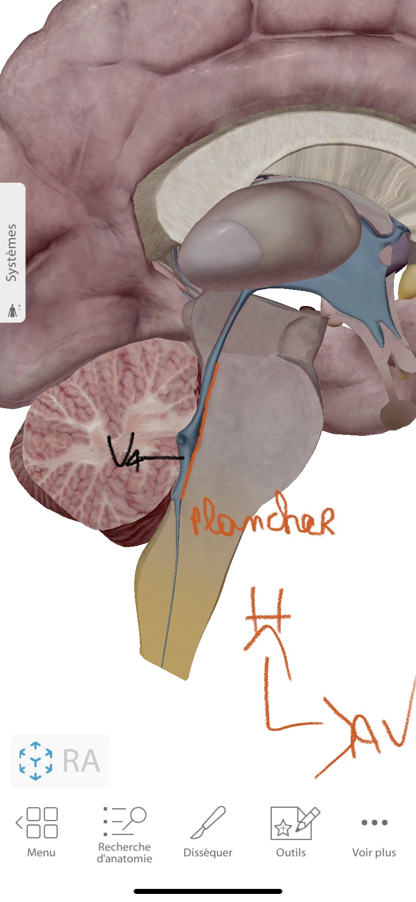 Je me suis embrouillée. Si le tut peut confirmer que du coup, la partie que l'on voit en vue POST de la fosse rhomboïde correspond bien au PLANCHER, qui est enfait en AVANT du V4 ? Merci