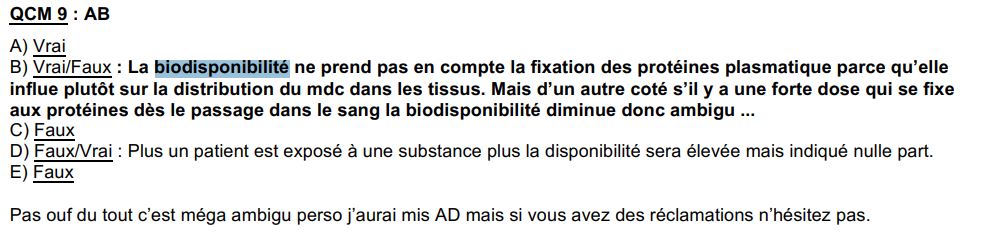 :arrow: Pour la A je l'ai mis vrai aussi en me basant sur la formule du cours : en effet, il a pris l'exemple de la voie orale sur la voie IV mais faut bien calculer parfois la biodisponibilité absolue d'autres voies d'administration. "Absolue" signifie qu'on utilise au dénominateur la voie de référence, celle qui a une biodisponibilité de 100%, à savoir l'IV. Mais celle au numérateur peut varier