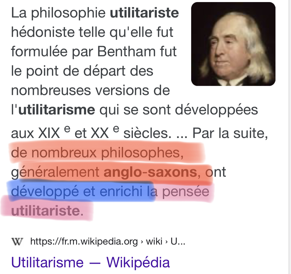 on va laisser de côté les cas particuliers qui ne répondent pas à la maximisation du bonheur pour la majorité des individus.Là on ne te parle de l'utilitarisme à dimension sacrificielle : on s'intéresse à l'autre versant de l'utilitarisme