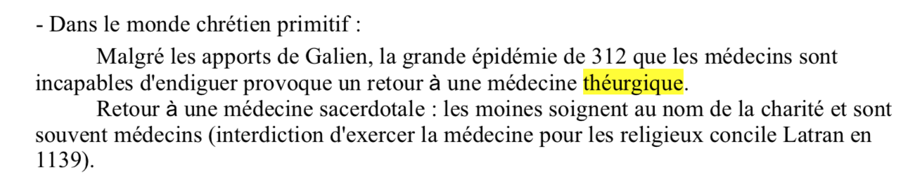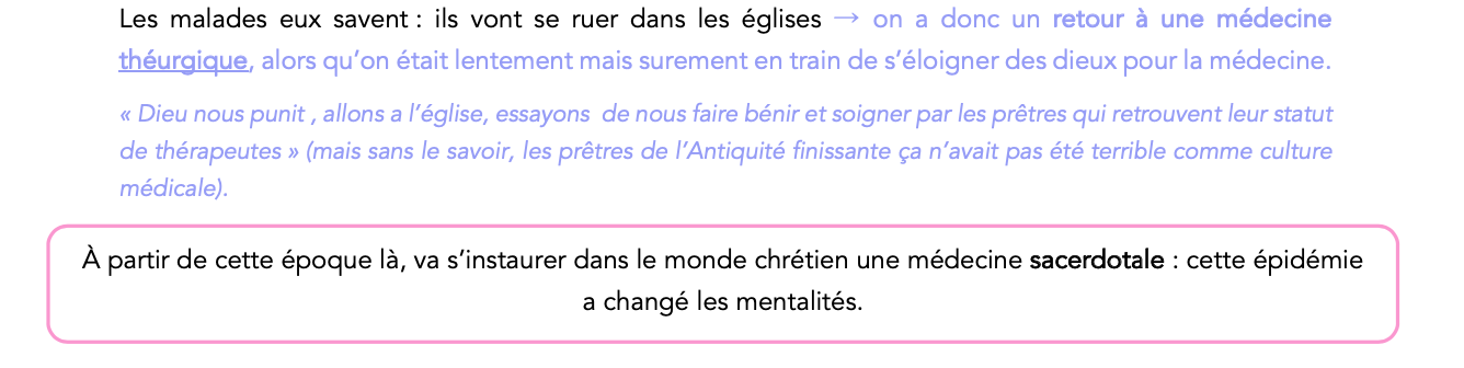 Dans la ronéo complétée y'a écrit qu'après l'épidémie de 312 on va avoir un retour à la médecine théurgique. Il y a aussi écrit que l'épidémie a changé les mentalités et le monde chrétien P instaure une med sacerdotale. cf photo