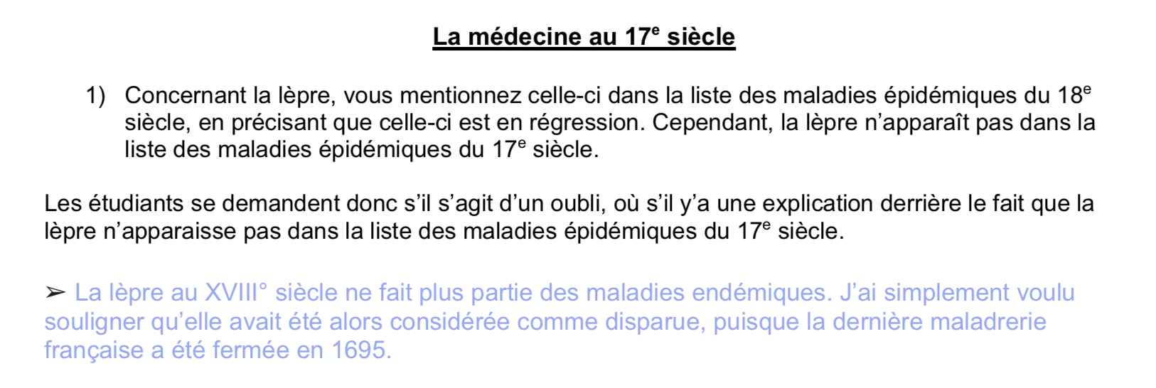 Dans les maladies du 17e on n'évoque pas la lèpre, pourtant au 18e on dit que la lèpre est en régression, donc bien présente au 17e ? Est ce que j'ai mal compris ou c'est un oubli dans la liste des pathos du 17e ?