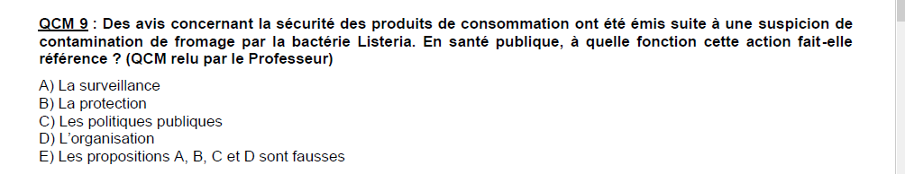 Salut, Pourquoi penses-tu que c'est la A ? En fait, ici le fait de surveiller reviendrait à constater que les fromages ont été contaminés par la bactérie Listéria, or ici, on intervient, on émet des avis de sécurité, donc on protège la population ! Lâche un résolu si c'est bon et bon confinement !