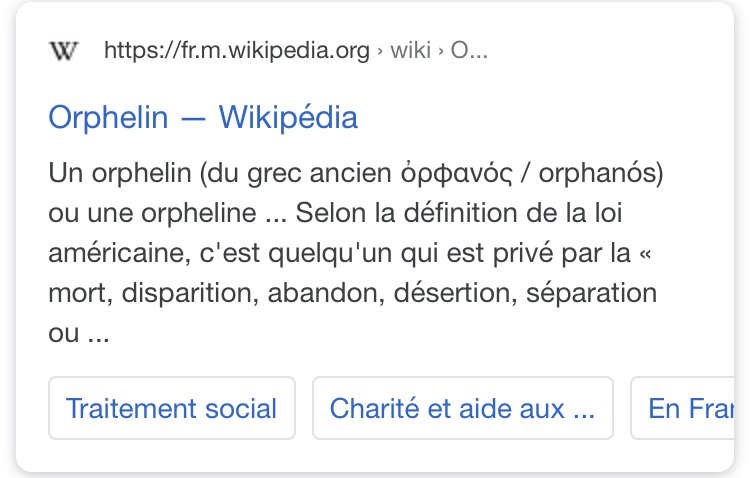 Désolé d’être chiant mais quand j’ai lu orphelin j’me suis pas posé la question sur l’etat De santé de ses parents. Pour moi (et comme indiqué sur le screen) la définition englobe la disparition de leur parents, que ce soit par mort ou par abandon(notre cas)
