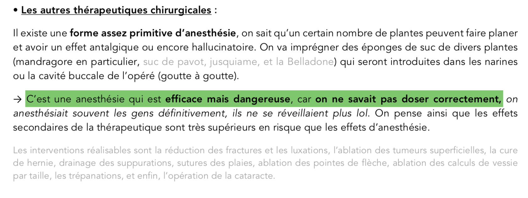 Salut, j'ai compté l'item D faux car je suis d'accord que l'anesthésie au Moyen-Age était dangereuse mais à aucun moment on dit qu'elle était efficace...