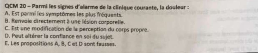 5) Les réponses A, C et D sont vraies ici aussi ! Pour la B le prof a énormément insisté là-dessus cette année, c'est un piège basé sur le fait que la douleur n'est pas obligatoirement liée à une lésion physique !
