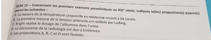 Alors concernant l'item A il est ambigu ++, j'ai posé une question au prof au sujet de la température corporelle, en demandant qu'il fasse un récap sur les différents noms qu'il cite dans ce passage. À ceci il a seulement répondu : "Wunderlich, Allbutt et Jaccoud ont participé à interpréter les variations de température du corps humain, mais c’est De Lorain qui produit un ouvrage de synthèse soulignant l’intérêt de la mesure de la température dans différentes situations pathologiques."