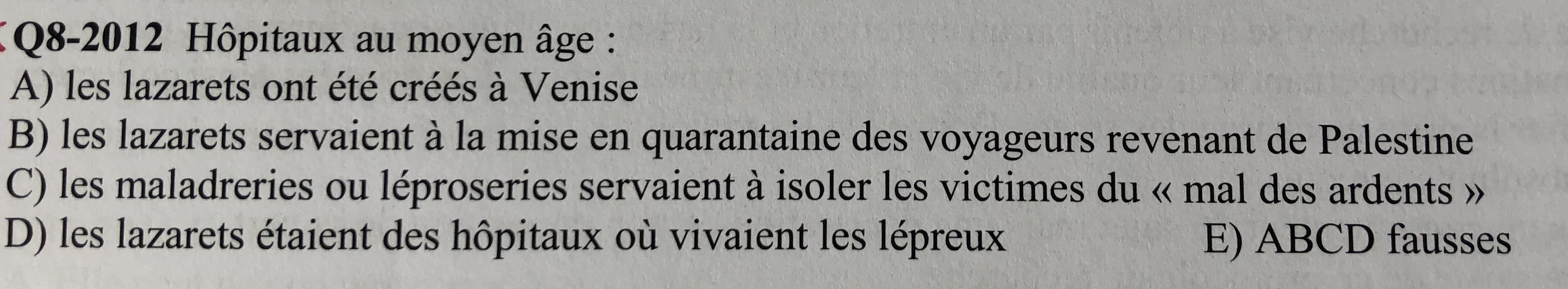 Et pour l'item D, je pensais que les lazarets étaient des établissements où on mettait les lépreux en quarantaine mais pas forcément des hôpitaux.