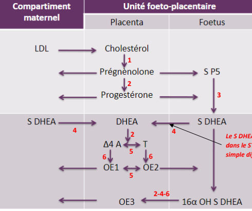 quand j'ai appris le tableau sur la stéroidogénèse, les synthèses de progestérone et d'oestrogènes sont " séparées". Pour moi, c'est la progestérone et non les oestrogènes qui sont produits à partir du cholestérol par les LDL maternels ...