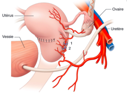 :arrow: L'artère utérine va d'abord surcroiser l'uretère, elle va passer dans la partie basse du ligament large (le paramètre) puis remonter vers le fond de l'utérus en longeant le mésomètre pour finir dans le fond de l'utérus et donner ses 3/4 terminales.