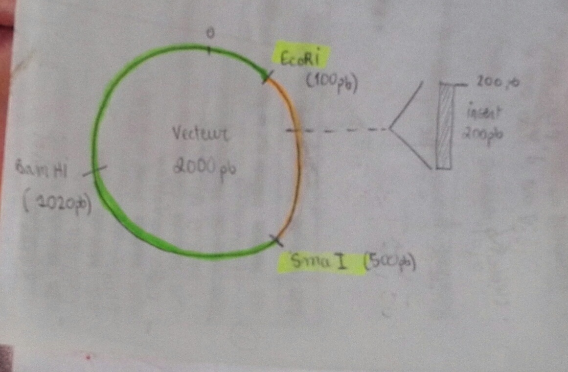 Si on choisit EcoRI et SmaI qui, selon la notice, coupe 2 fois le vecteur : EcoRI à 100pb et Sma I à 500pb. On te dis aussi que l'insert est inséré en position 200 sur le vecteur.