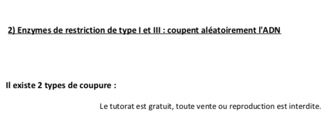 Coucou ! C’est texto du cours 😜 les enzymes de type 1 et 3 coupent l’ADN de manière aléatoire, contrairement aux enzymes de type 2 qui coupent de manière spécifique et reproductible