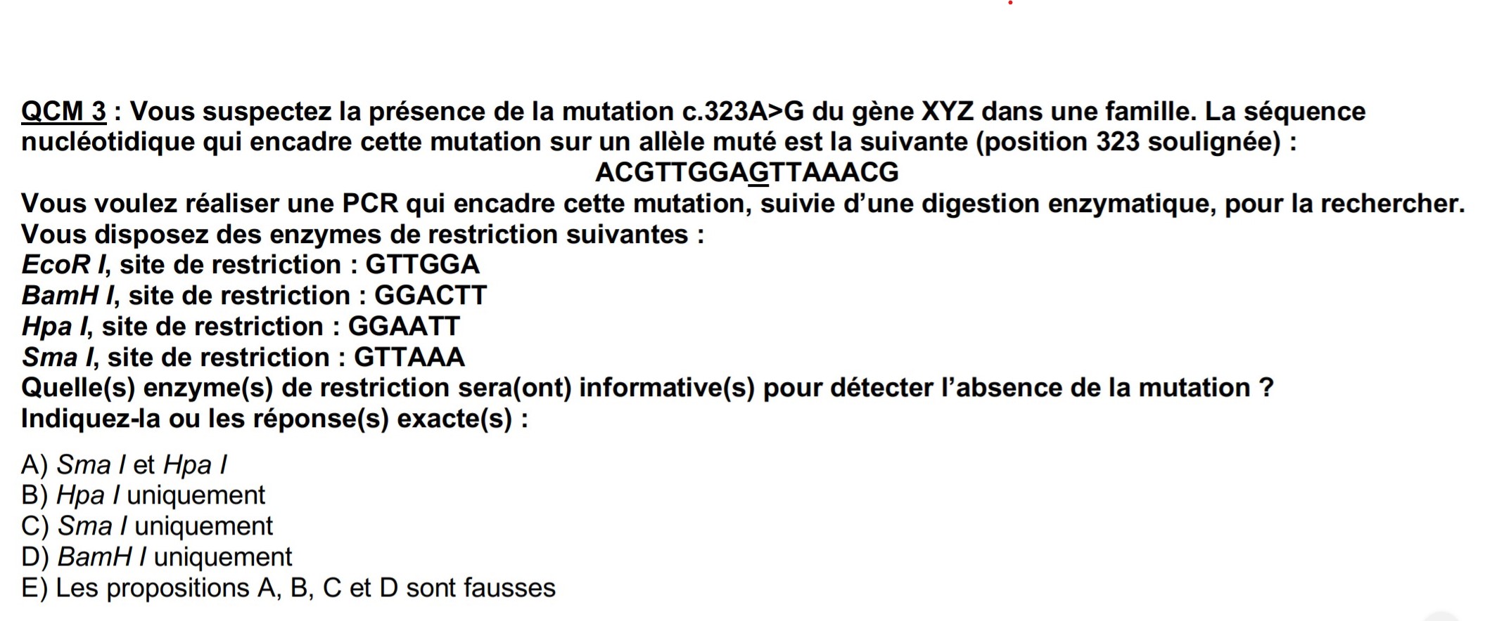 La correction dit que la réponse est la A mais je ne comprend pas parce que HPA I coupe si il y a l’allèle muté or dans la question on nous demande les enzymes qui détectent l'absence de mutation