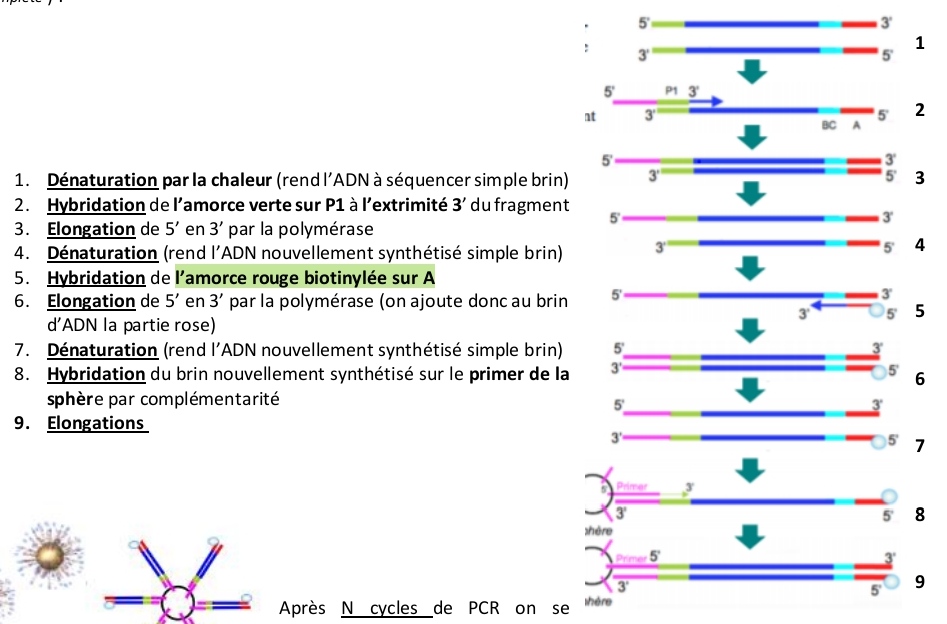 Bonjour, où est ce que l'on considère que s'arrête l'amplification clonale par PCR en émulsion ? parce que je pensais que ça correspondait seulement au micro réacteur et du coup je ne vois pas à quoi correspond la dernière étape d'élongation, je pensais que l'élongation se faisait dans la puce à ADN avec l'envoi des Dntp les uns après les autres. Est-ce que vous pourriez me réexpliquer svp ?